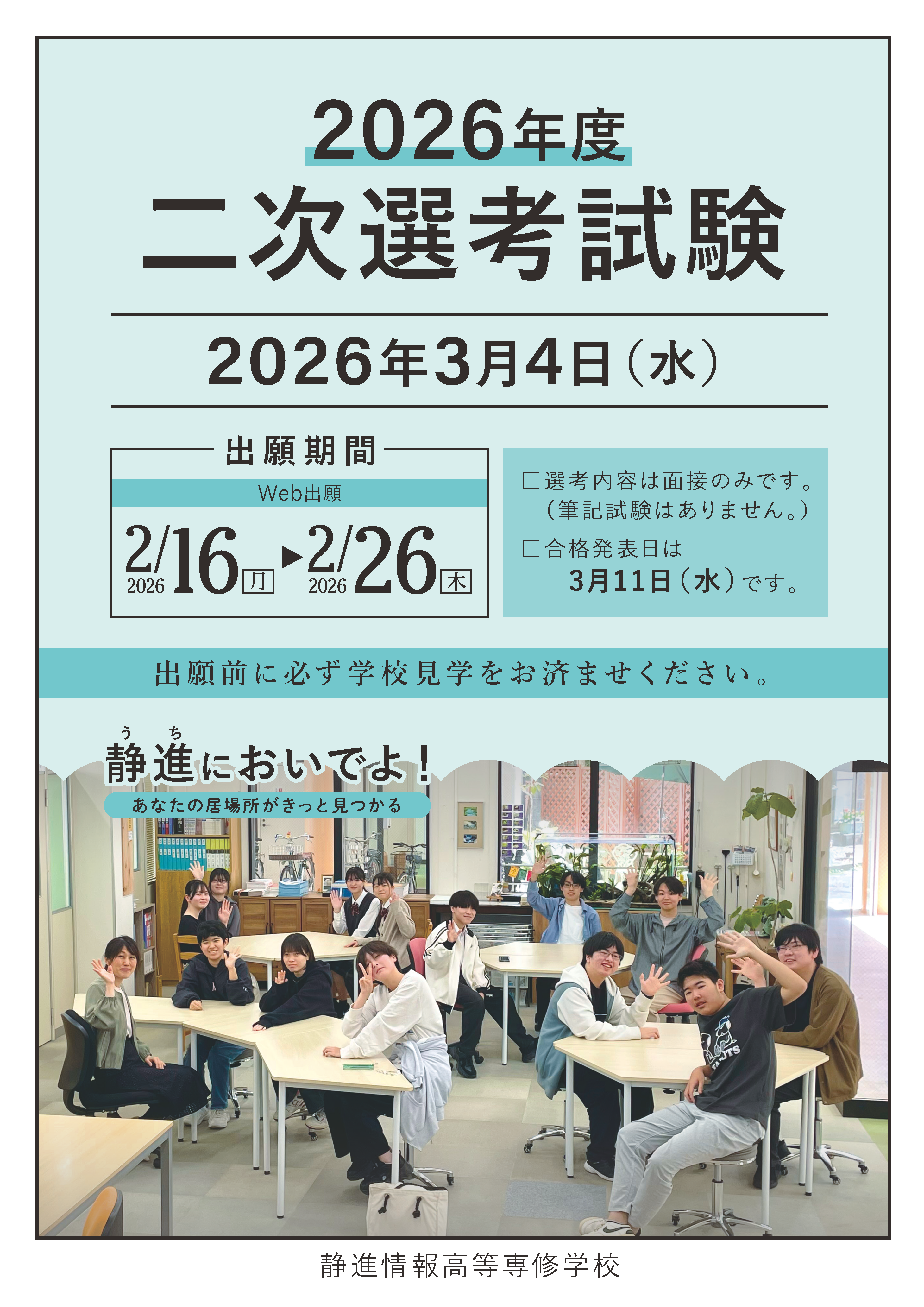 ご不明な点がありましたら、お気軽にお問合せ下さい。※出願するには「学校見学」を済ませている必要があります。